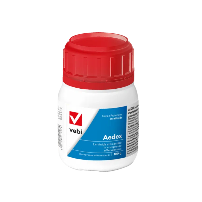 Aedex è un larvicida in compresse effervescenti. È estremamente efficace contro tutte le specie di zanzare (compresa la Zanzara Tigre). Aedex esplica la sua azione per ingestione e contatto,