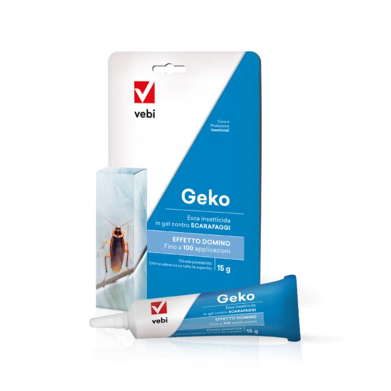 GEKO è un’esca formulata come gel pronto all’uso per il controllo di tutte le specie di scarafaggi (Blattella germanica, Periplaneta americana, Blatta orientalis, Suppella longipalpa, Polyphaga aegyptiaca). Il gel è efficace su blatte di tutte le età, sui maschi e sulle femmine. GEKO contiene Imidacloprid, sostanza attiva di nuova generazione appartenente alla famiglia dei neo-nicotinoidi. Il prodotto agisce per contatto e ingestione sulla trasmissione nervosa a livello post-sinaptico. GEKO combina attrattività, palatabilità ed efficacia insetticida.