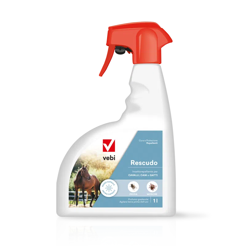 RESCUDO è un insetto-repellente che funziona su cavalli, cani e gatti grazie all’azione combinata del DEET, un principio attivo utilizzato come repellente ad uso umano, con il Geraniolo. Il prodotto è efficace fino a 24 ore, grazie alla tecnologia messa a punto da Vebi: la microincapsulazione. Il DEET, infatti, è racchiuso all’interno di microcapsule che rilasciano il principio attivo lentamente, protraendo l’efficacia del prodotto nel tempo. Il Geraniolo, invece, è libero e protegge immediatamente gli animali dall’attacco di mosche e zecche.